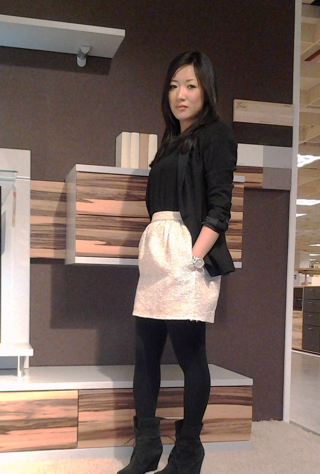 | Satin-trimmed blazer & golden tweed skirt, suede boots: Zara, faux leather collar top: H&M Divided |